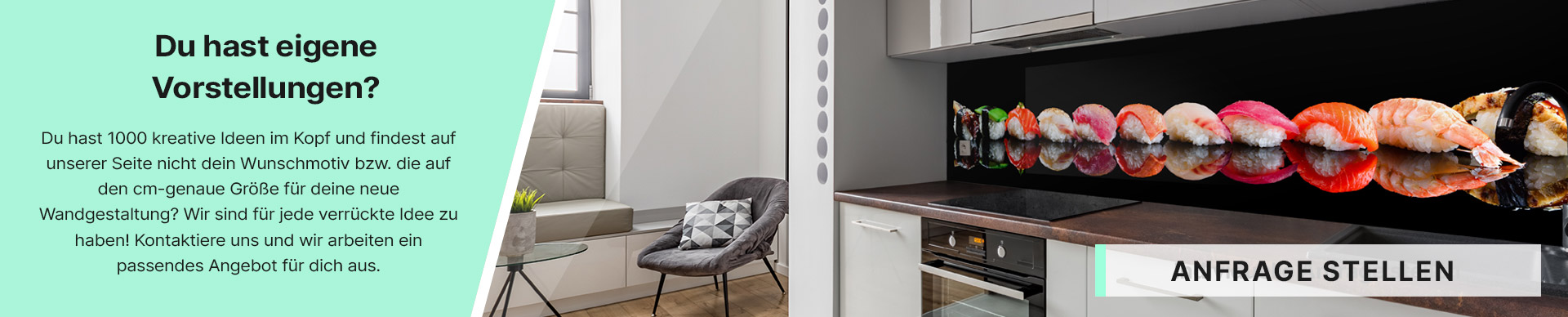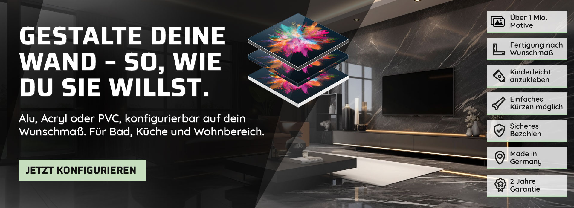 Bei unseren individuellen Rückwänden handelt es sich um robuste Wandpaneele bzw. Wandplatten, also Rückwände aus Aluminium, Acrylglas oder Hartschaum PVC. Das Besondere: Die Wandverkleidungen können überall eingesetzt werden: im Innen- als auch in Außenräumen, in Trocken- aber auch in Feucht- und Nassräumen. Alle Materialien sind von der Beschaffenheit robust, langlebig und wasserfest. Somit kannst du die Wandpaneele ideal als Spritzschutz, Dekowand, Wandverkleidung, Fliesenersatz, Tapetenersatz oder auch als XXL-Wandbild verwenden.