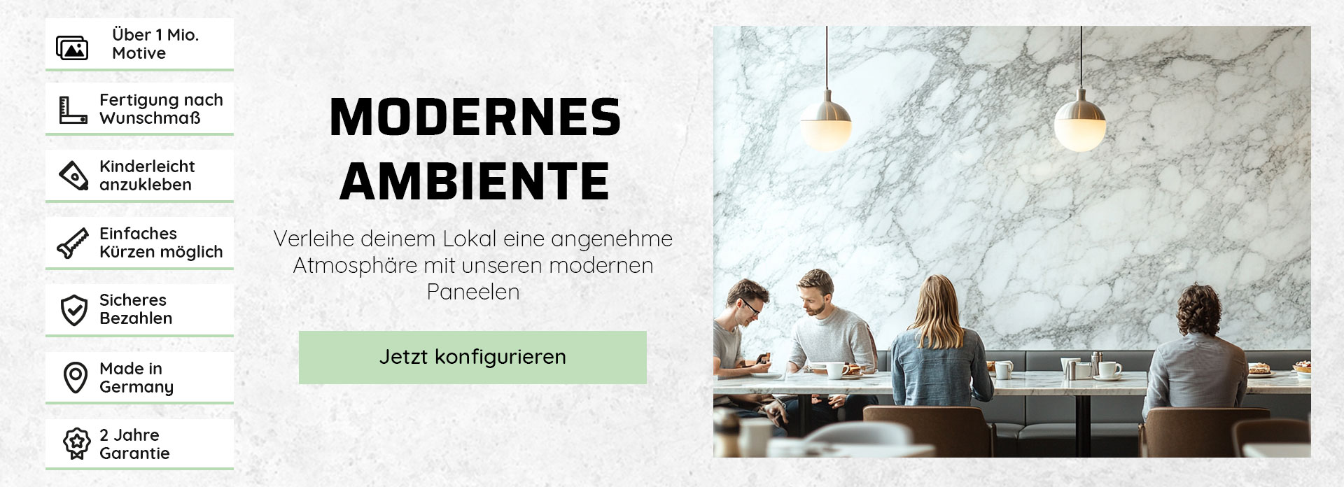 Wir von dedeco stehen dir bei deinen kreativen Gestaltungsideen zur Seite und stellen Wandpaneele nach individuellen Motiven und Maßen her. Mit langjähriger Erfahrung und Spezialwissen im Bereich Raum- und Wandgestaltung sowie einer eigenen Inhouse-Designagentur modernisieren wir mit individuellen Rückwänden deine Räumlichkeiten in Mietwohnungen, Eigenheimen, auf Großveranstaltungen sowie in Gastronomien und Hotellerien.