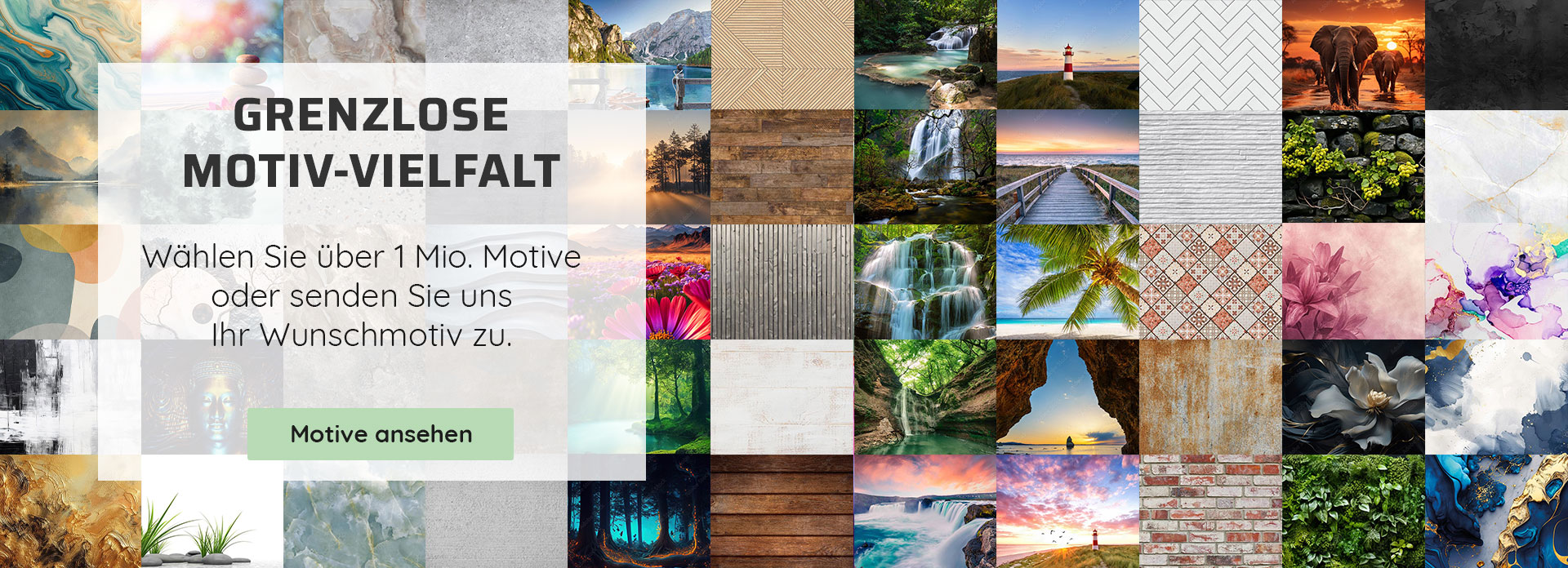 Es stehen dir eine Vielzahl von verschiedenen Motiven, beispielsweise aus den Kategorien Holz, Steine, Beton, Marmor, Natur, Abstrakt, Städte, Wasserfälle, etc. zur Auswahl. Zusätzlich hast du die Möglichkeit zwischen verschiedenen Materialien, wie Aluminium, Acrylglas und Hartschaum PVC, und Stärken zu wählen.