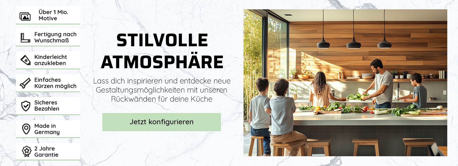 Nutze unseren Konfigurator und erstelle deine eigenen Rückwände in nur 4 Schritten. Wähle im ersten Schritt den Anwendungsbereich aus. Anschließend kannst du die Anzahl der benötigten Rückwände auswählen sowie die jeweiligen Rückwand-Größen eingeben. Im dritten Schritt hast du die Möglichkeit aus verschiedenen Kategorien dein Lieblingsmotiv auszusuchen. Deine Auswahl und auch deine Eingabe wirkt sich direkt auf das Darstellungsbild aus, d.h. ein personalisierter Entwurf wird direkt ausgearbeitet und dir veranschaulicht. In diesem Schritt kannst du ebenfalls das Motiv spiegeln oder den Ausschnitt des Bildes durch Verschieben des Cursors bearbeiten. Im vierten Schritt geht es nur noch um die Materialauswahl und die Veredelungsoptionen. In Feucht- und Außenräumen empfehlen wir die Veredelungsoption mit auszuwählen.