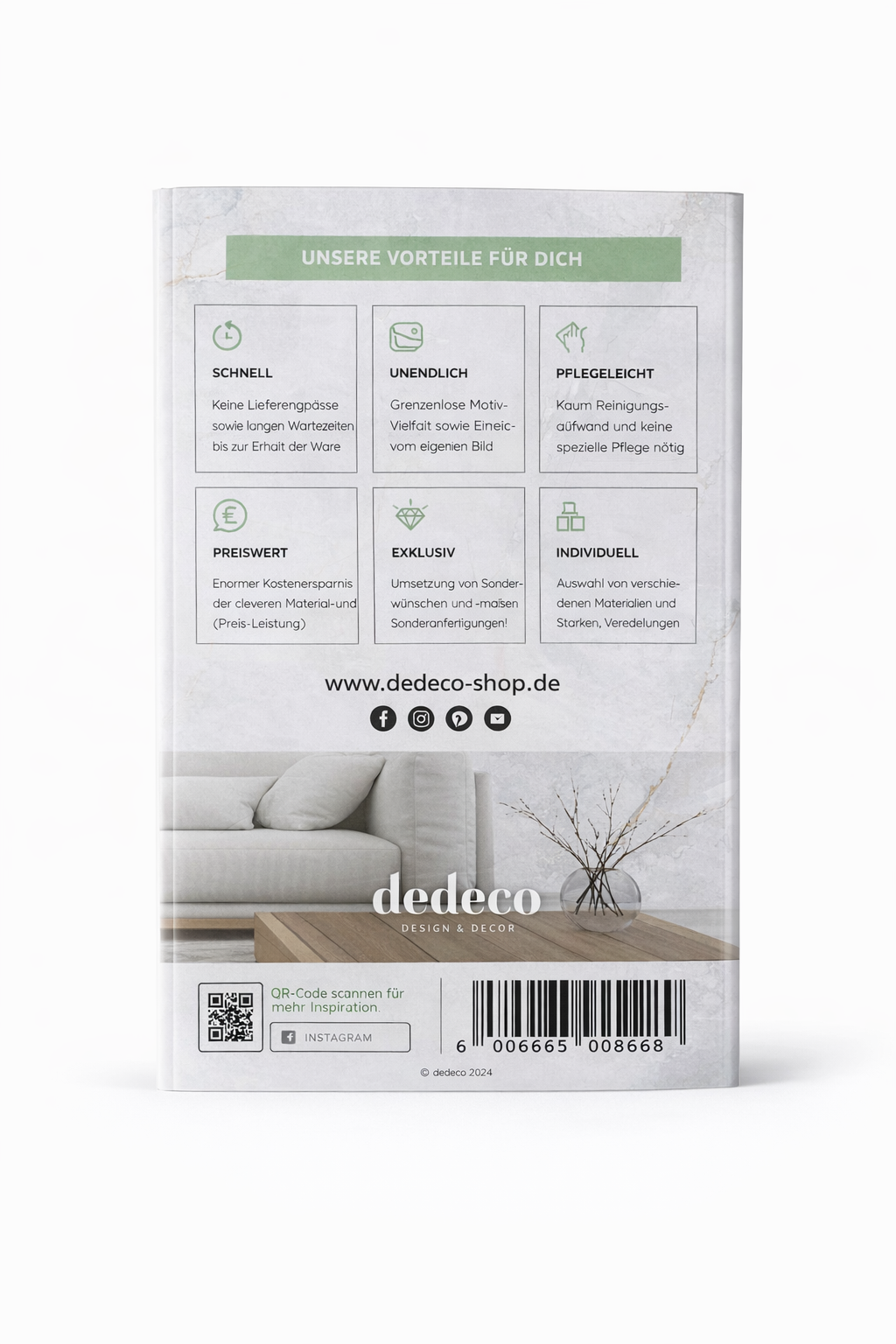 Er enthält zahlreiche Inspirationsbeispiele, Motivübersichten, Materialbeschreibungen, Veredelungsoptionen sowie Informationen zu Anwendungen, Montage und Pflege.