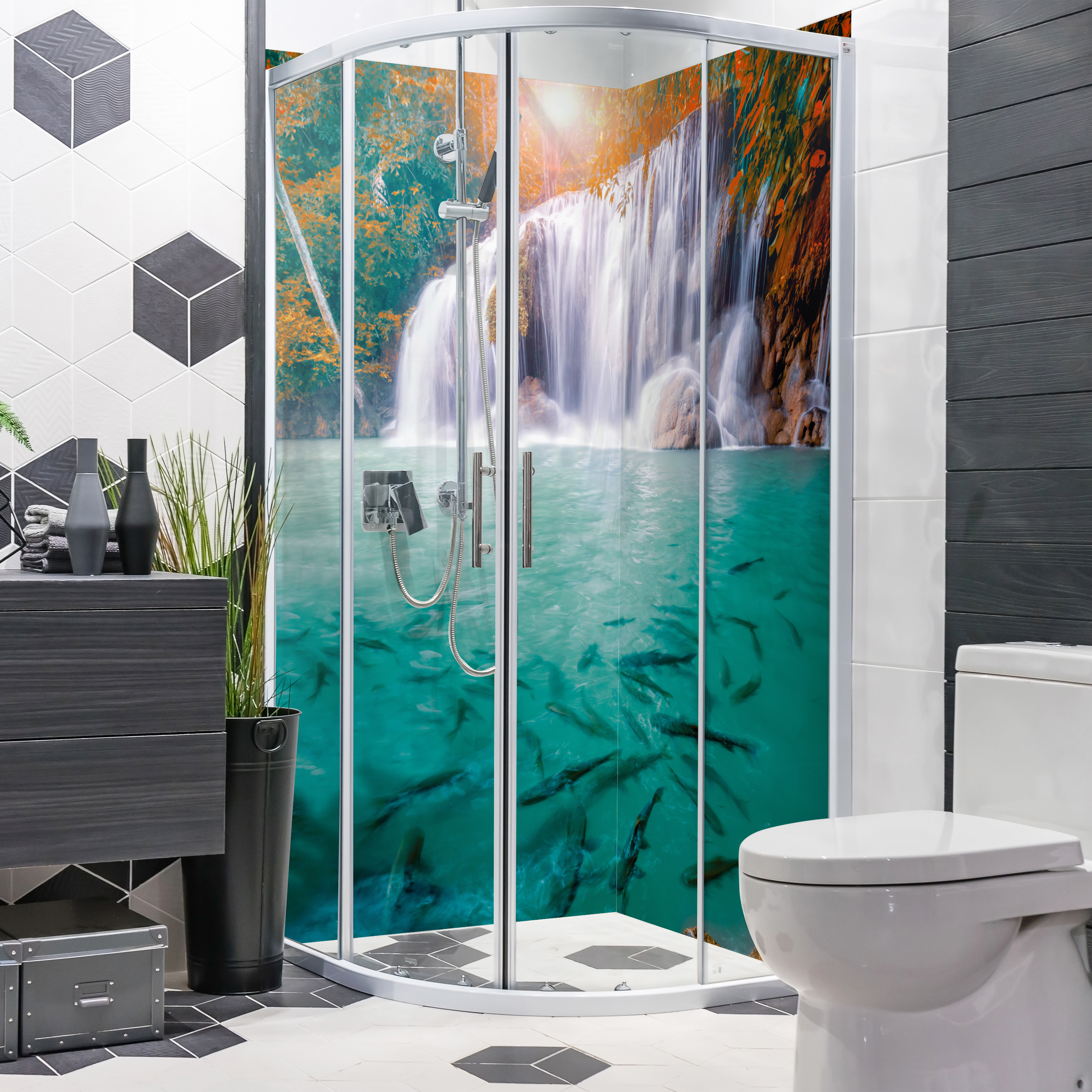 Duschrückwand mit Wasserfall V16 Motiv, als Badrückwand zum Fliesenersatz