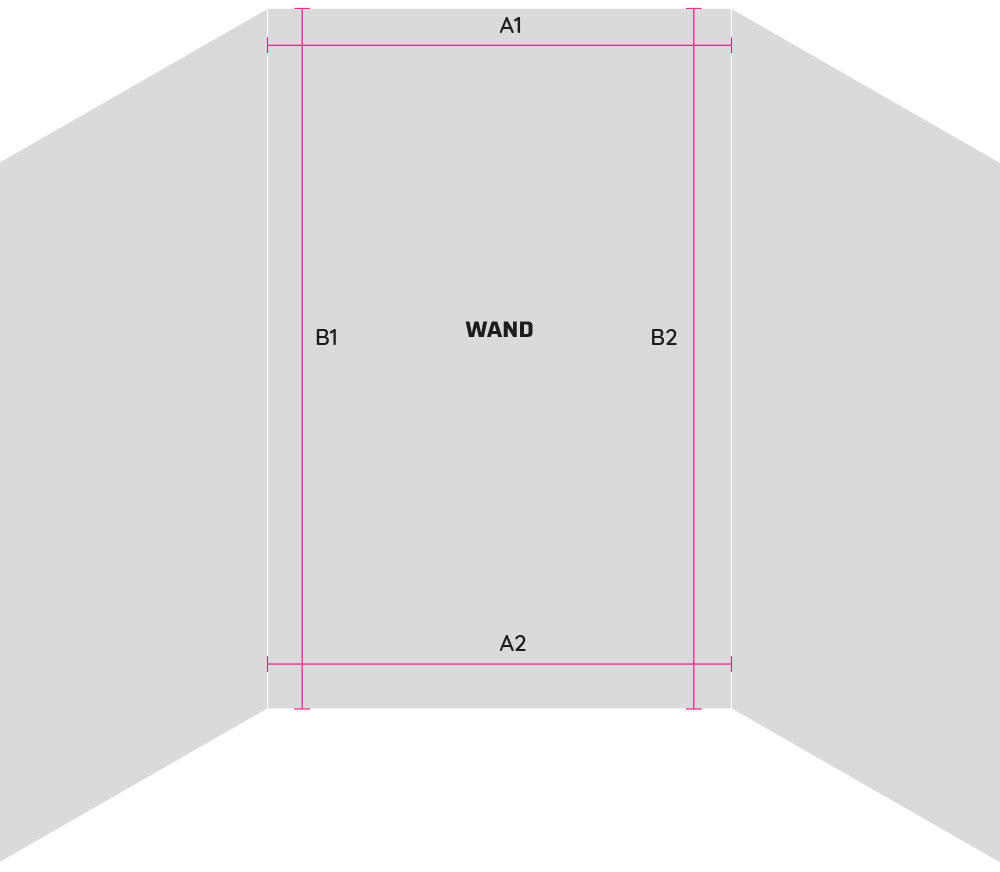 Im unten dargestellten Schaubild siehst du, dass sowohl die Höhe (B1 und B2), als auch die Breite (A1 und A2) an zwei verschiedenen Stellen gemessen werden sollten, da nicht jede Wand bzw. jeder Boden eben ist. Solltest du nach dem Messen feststellen, dass deine Untergrundfläche unterschiedliche Höhen bzw. Breiten aufweist, bspw. eine Differenz von 5mm, kannst du dich an die kleinere Zahl halten, da der Unterschied nach Montage und der Verwendung von Silikonfuge kaum sichtbar ist.