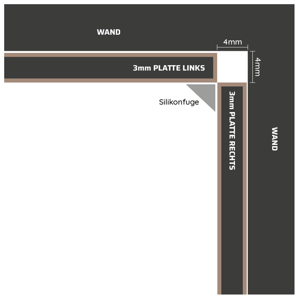 Bei einer Ecklösung, bspw. einer Eck-Dusche mit 3mm Wandpaneelen solltest du folgende Informationen beachten: