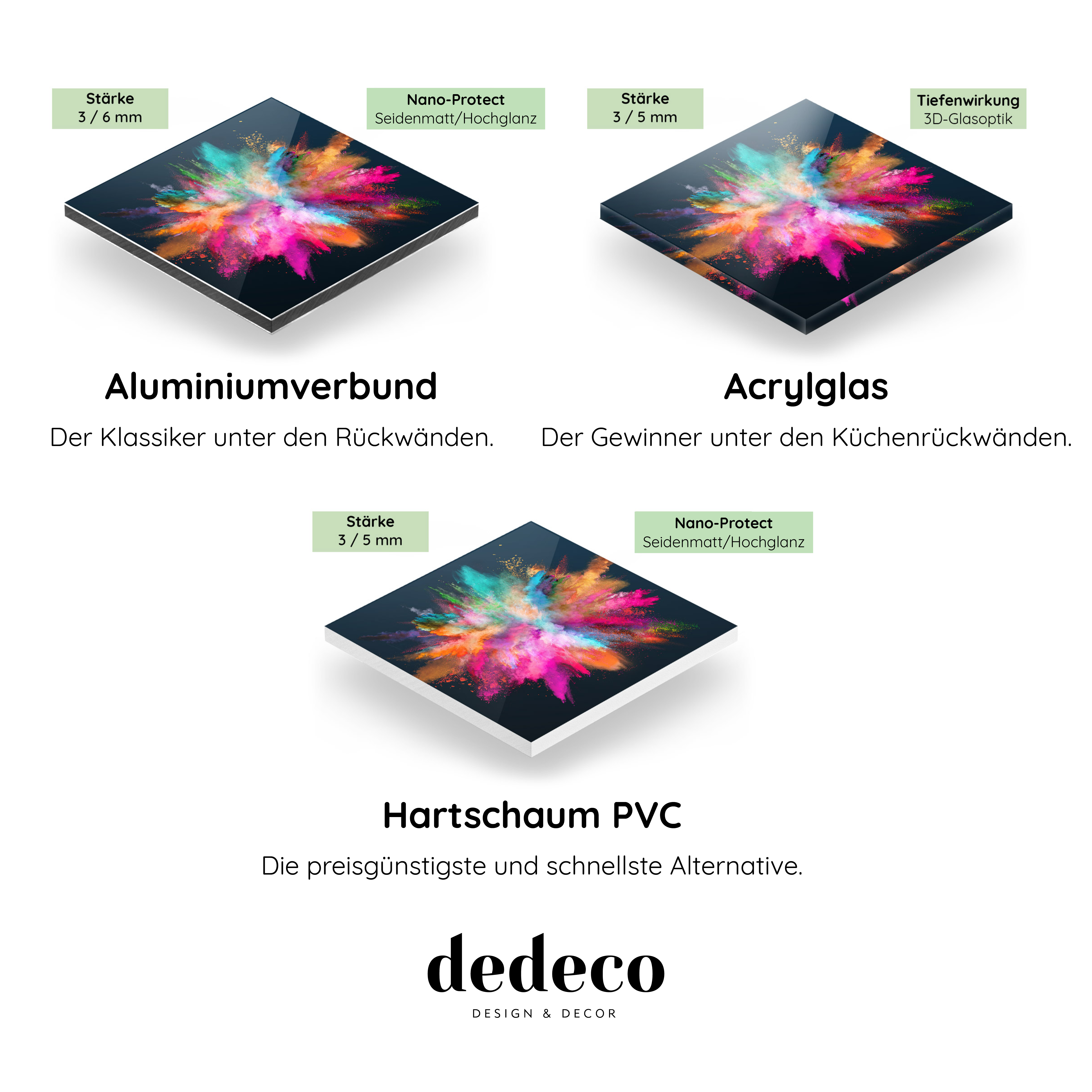 - Alles aus einer Hand: Das passende dedeco Montageset findest du ebenfalls in unserem Shop. Auf Anfrage bzw. mithilfe unseres Konfigurators kannst du deine perfekte Küchenrückwand (ggf. mit Steckdosen-Aussparungen) auf Maß bestellen.