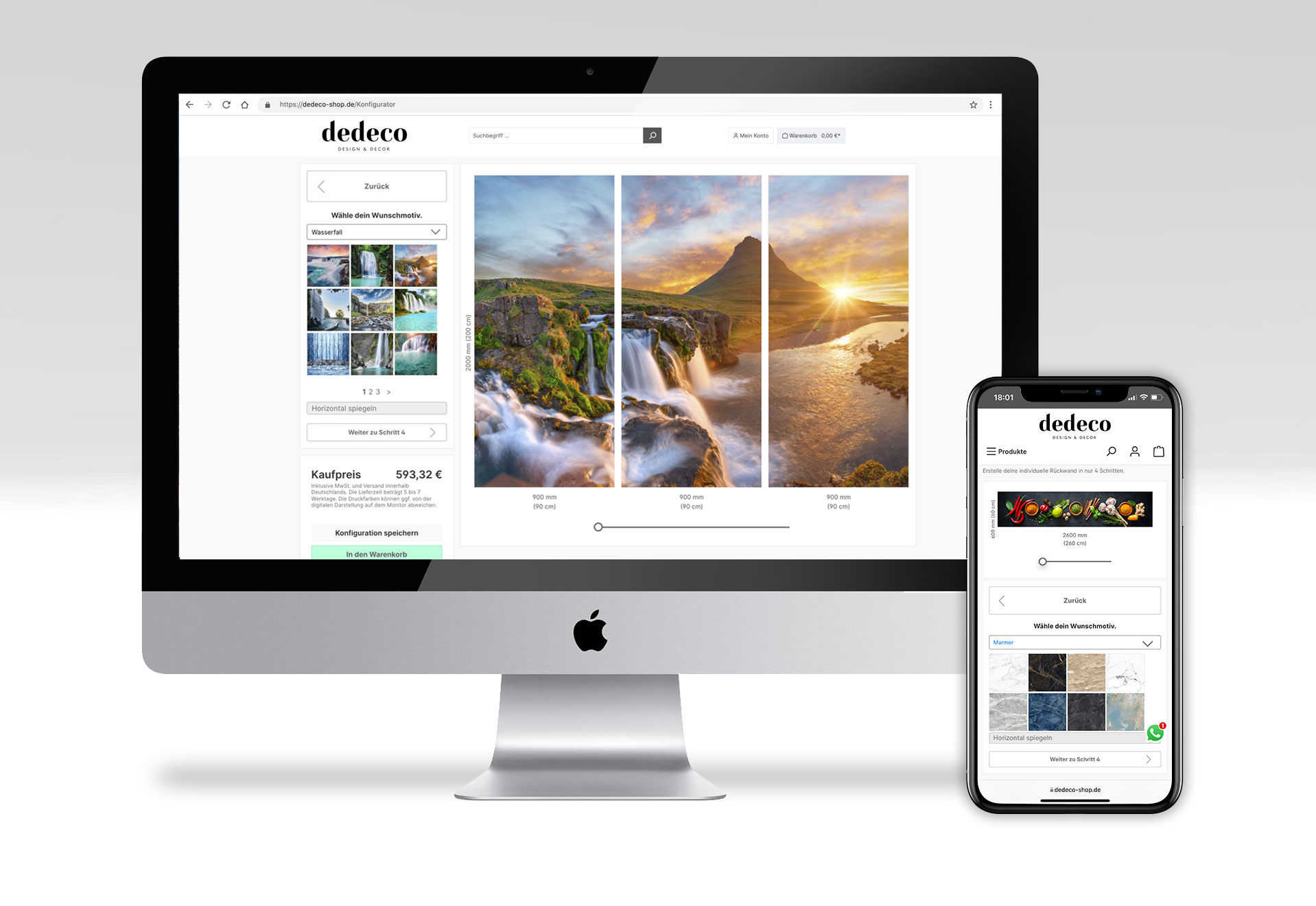 Erstelle in nur 4 Schritten deine individuelle Rückwand. So einfach geht es: Wähle den Anwendungsbereich, die Größe sowie die Anzahl der Rückwände. Anschließend kannst du dein Wunschmotiv, das Material und die Zusatzveredelung auswählen.