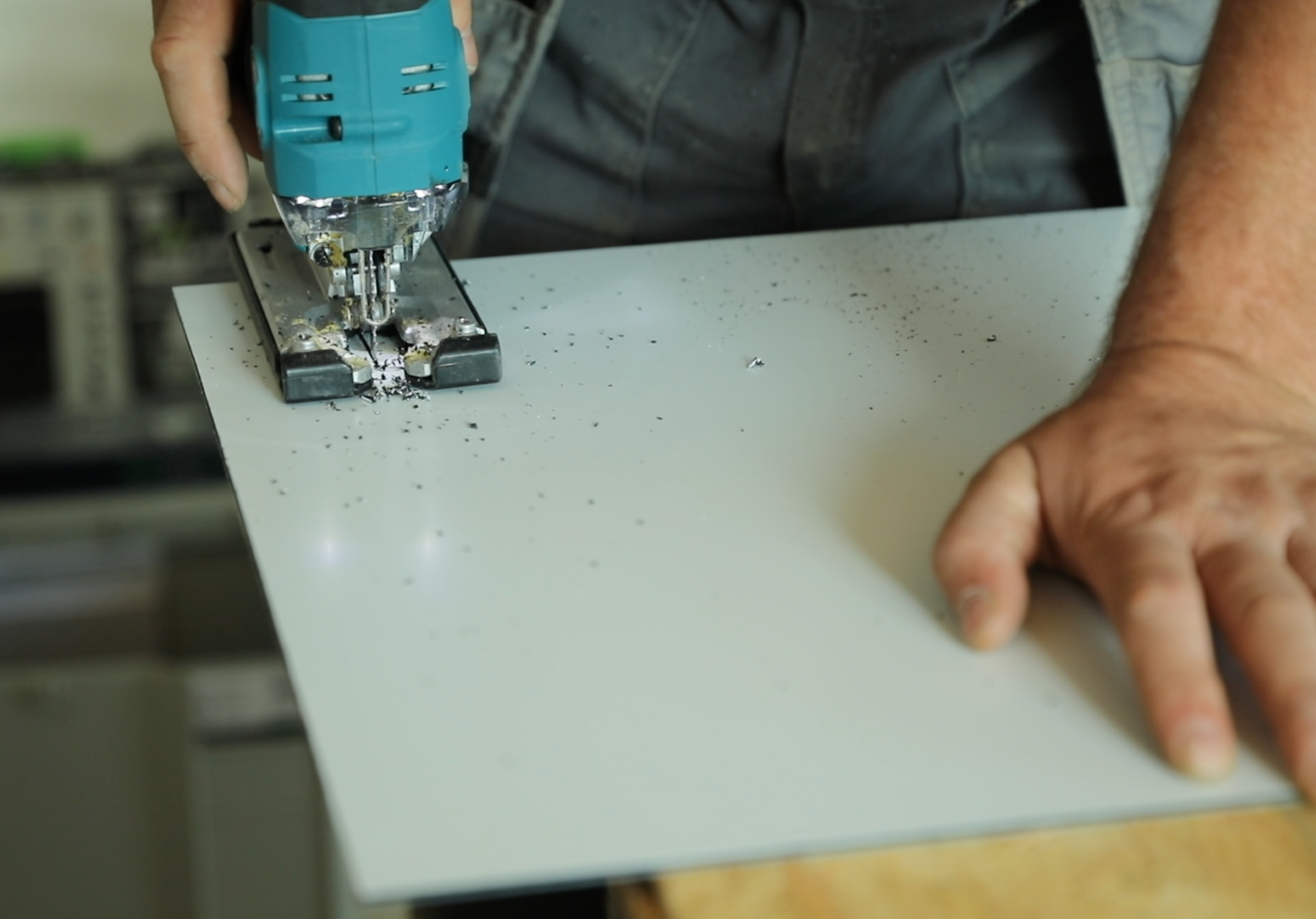 Zeichne die Schnittlinie auf ein Stück Malerklebeband, welches du auf die Platte fixierst, Verwende stets ein Sägeblatt mit einer feinen Verzahnung, beispielsweise ein Sägeblatt, welches zur MItte hin feiner ist. Wähle weiterhin eine Säge mit einer guten Spanabfuhr und einer hohen Drehzahl, um eine ausgefranste Schnittkante zu vermeiden. Für das Ausbohren von Löchern kannst du auch eine Bohrkrone verwenden. Achte beim Sägen und Bohren von Acrylglas darauf, Sägeblätter und Bohrer zu nutzen, die für PMMA geeignet sind. Bevor du mit dem Sägen loslegst, solltest du dir eine Schutzbrille und einen Gehörschutz aufsetzen - safety first.