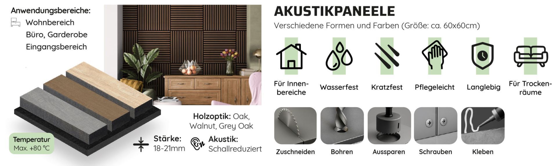 Akustischer PET-Filz ist ein nachhaltiges Material, das aus recycelten PET-Flaschen gewonnen wird. Es zeichnet sich durch seine Langlebigkeit, Leichtigkeit und herausragenden schallabsorbierenden Eigenschaften aus. Dieses Material reduziert die Nachhallzeit in Räumen effektiv, indem es Schallwellen dämpft. Das Holzfurnier ist ein natürliches Material, das deinem Interieur eine warme und authentische Ausstrahlung verleiht. Durch die einzigartige Maserung und variable Haptik wird jedes Paneel zu einem unverwechselbaren Unikat.