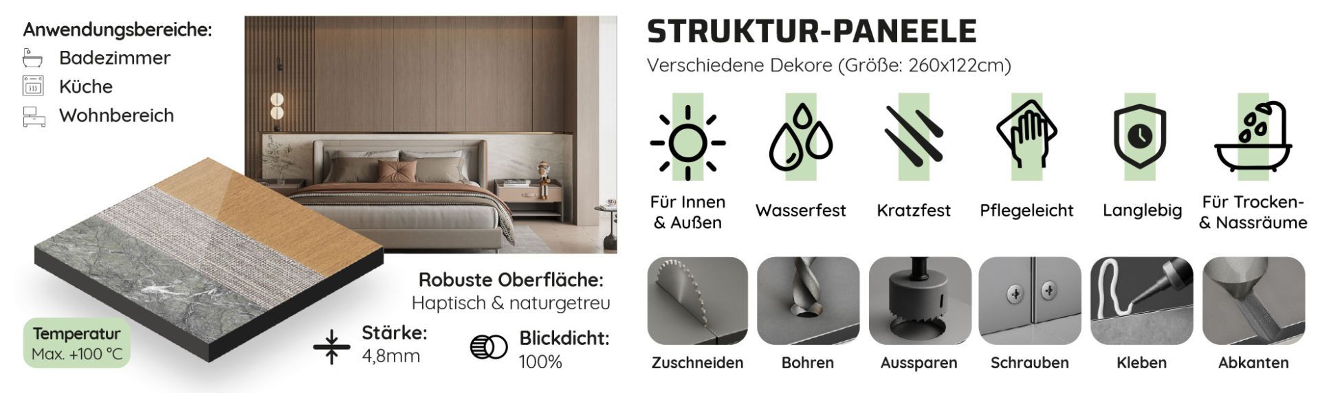 Dank ihrer vielseitigen Eigenschaften eröffnen Struktur-Paneele nicht nur funktionale, sondern auch ästhetische Möglichkeiten – nachhaltig, modern und langlebig.