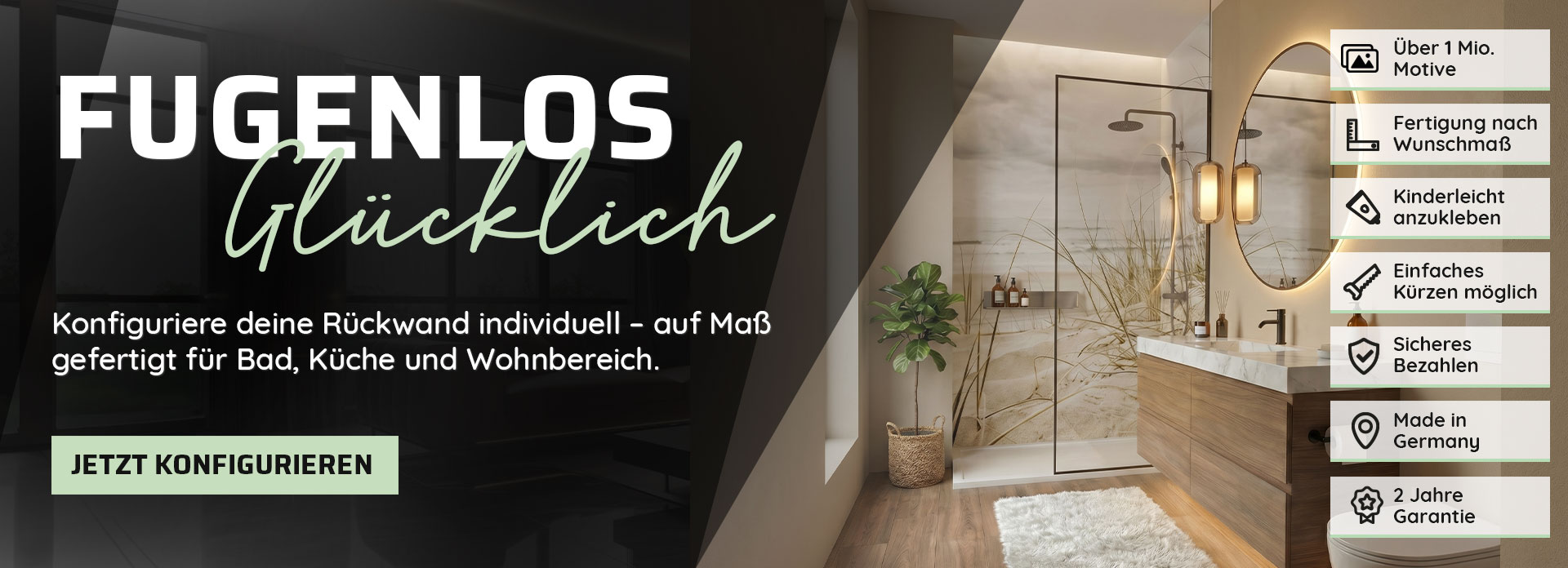 Nutze unseren Konfigurator und erstelle deine eigenen Rückwände in nur 4 Schritten. Wähle im ersten Schritt den Anwendungsbereich aus. Anschließend kannst du die Anzahl der benötigten Rückwände auswählen sowie die jeweiligen Rückwand-Größen eingeben. Im dritten Schritt hast du die Möglichkeit aus verschiedenen Kategorien dein Lieblingsmotiv auszusuchen. Deine Auswahl und auch deine Eingabe wirkt sich direkt auf das Darstellungsbild aus, d.h. ein personalisierter Entwurf wird direkt ausgearbeitet und dir veranschaulicht. In diesem Schritt kannst du ebenfalls das Motiv spiegeln oder den Ausschnitt des Bildes durch Verschieben des Cursors bearbeiten. Im vierten Schritt geht es nur noch um die Materialauswahl und die Veredelungsoptionen. In Feucht- und Außenräumen empfehlen wir die Veredelungsoption mit auszuwählen.