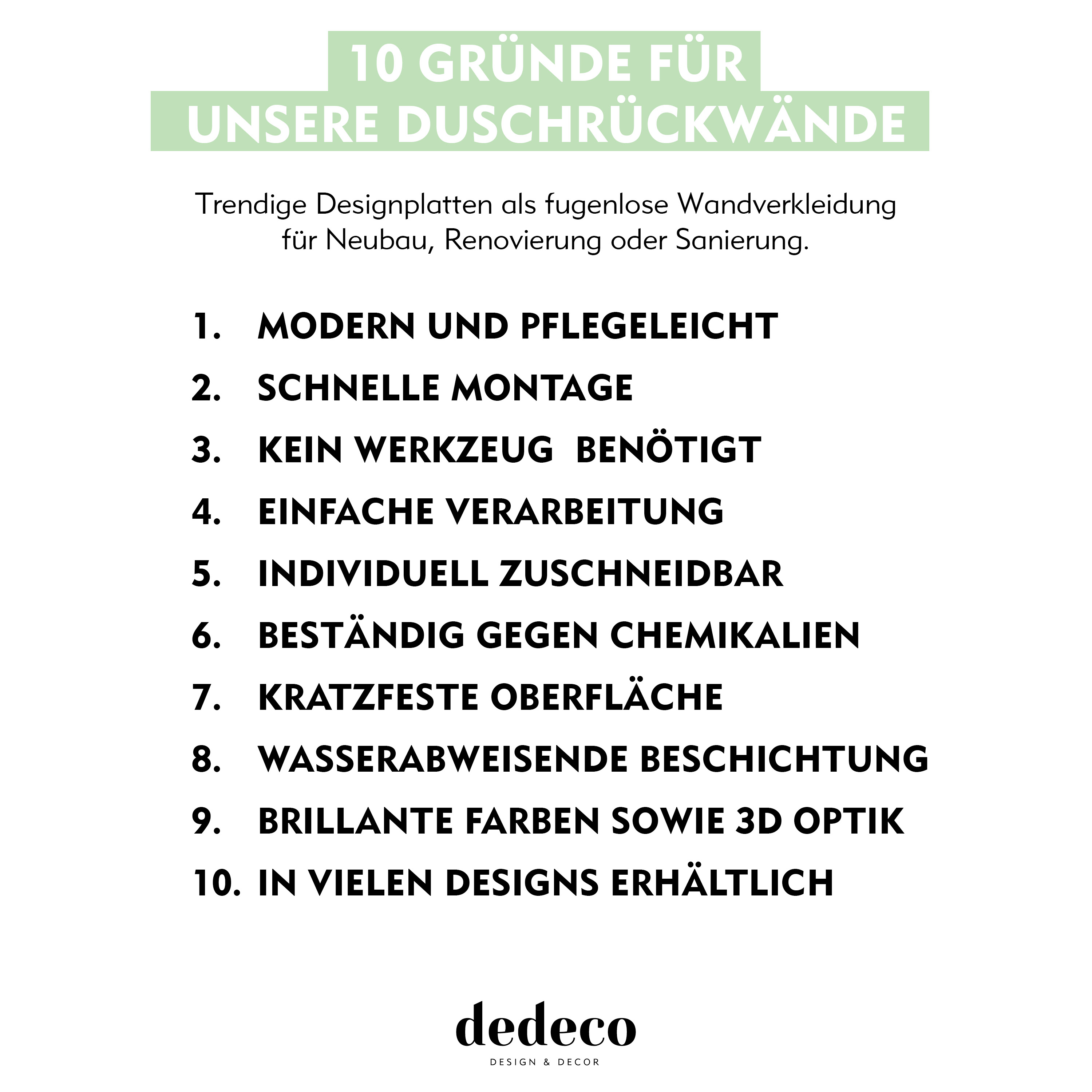 - Alles aus einer Hand: Das passende dedeco Montageset findest du ebenfalls in unserem Shop. Auf Anfrage bzw. mithilfe unseres Konfigurators kannst du deine perfekten Duschrückwände auf Maß bestellen