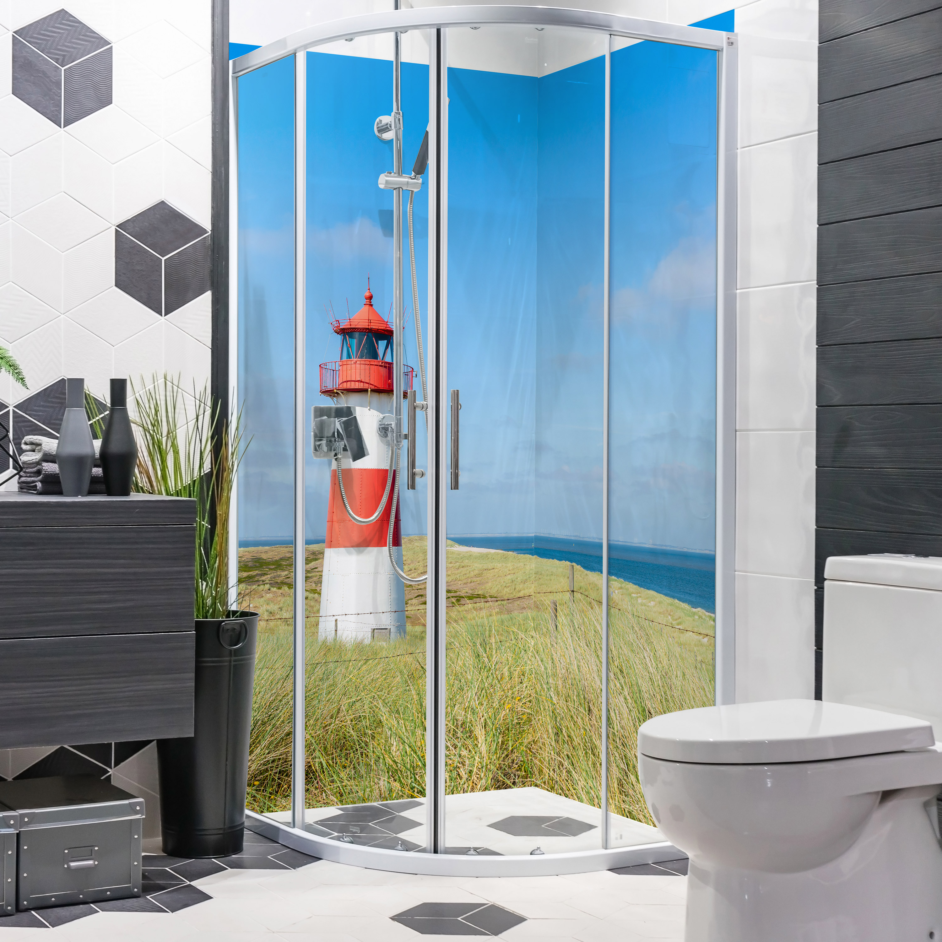 Duschrückwand mit Leuchtturm V2 Motiv, als Badrückwand zum Fliesenersatz