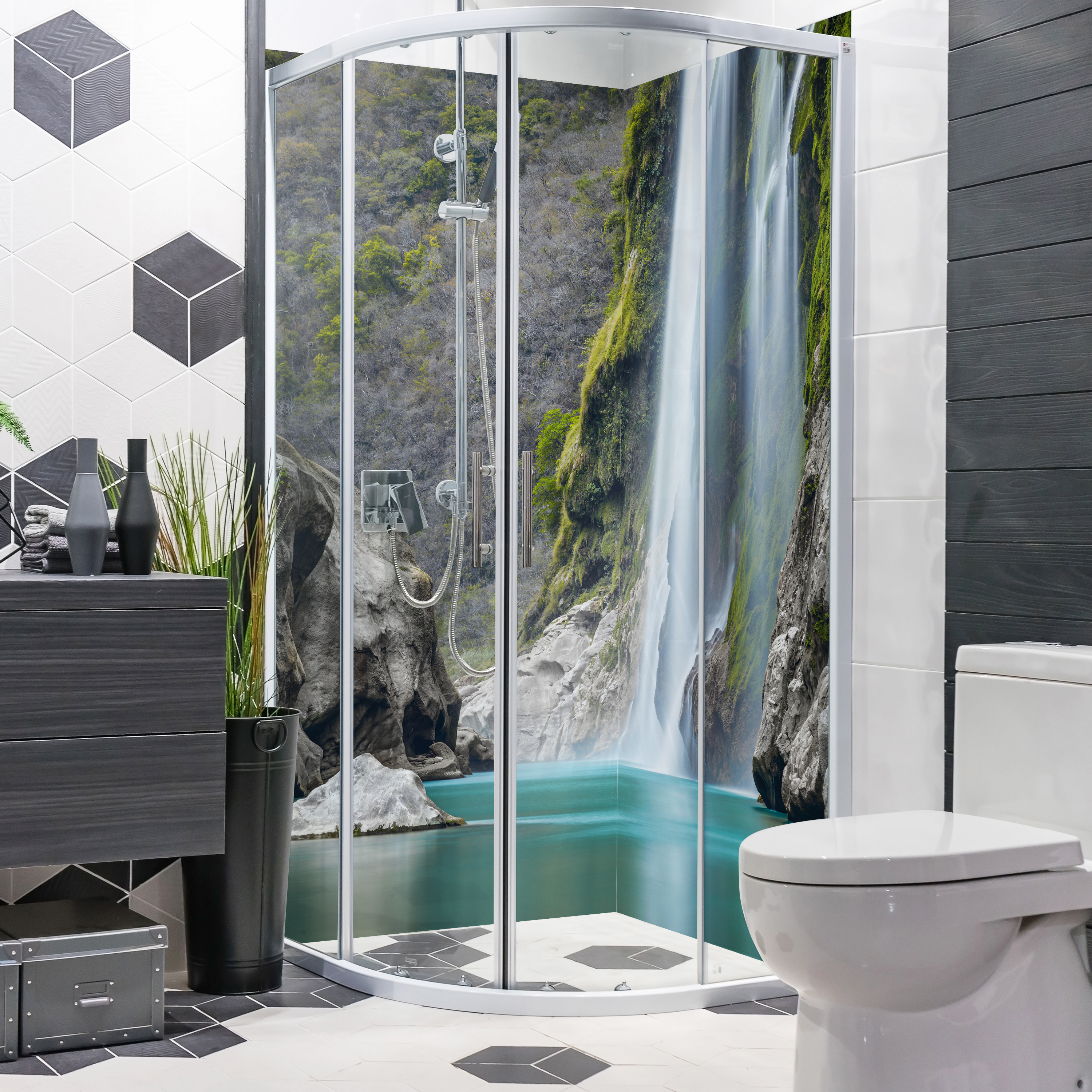 Duschrückwand mit Wasserfall V15 Motiv, als Badrückwand zum Fliesenersatz