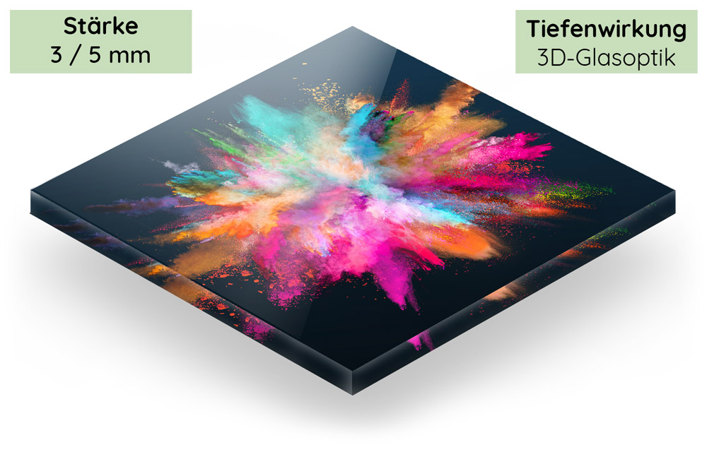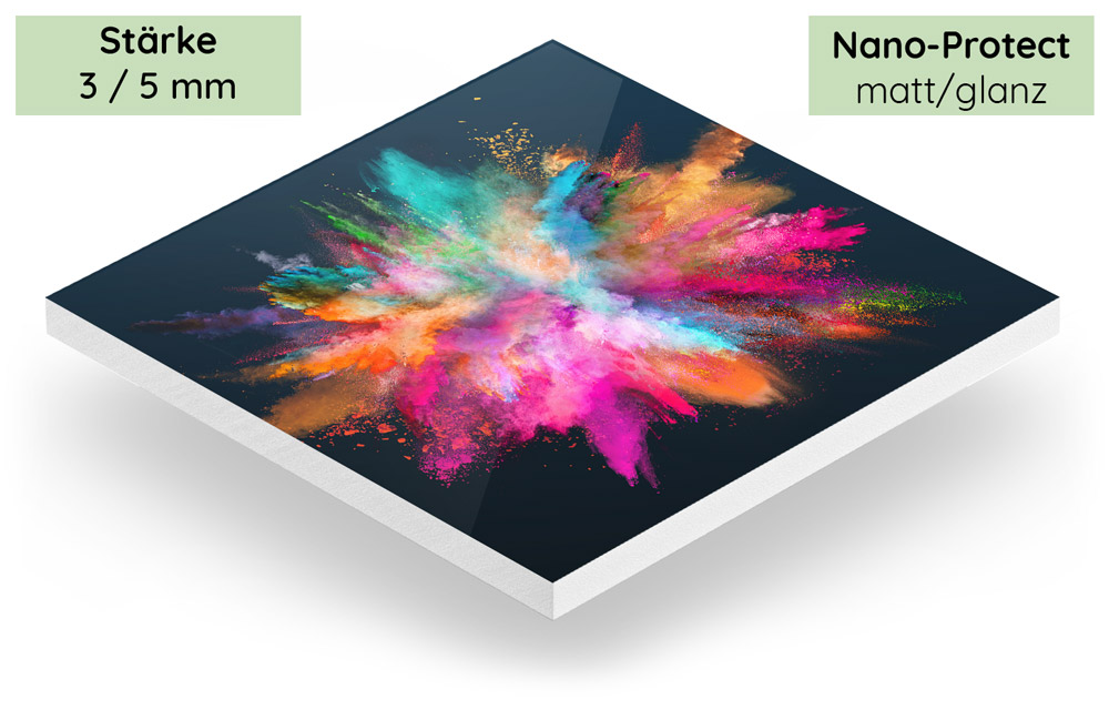 Nach mehreren chemischen Prozessen entsteht ein leichter, widerstandsfähiger Werkstoff in Glasoptik. Acrylglas ist leicht, bruchsicher und Temperaturschwankungen gegenüber unempfindlich. Die Bilder haben hinter Acrylglas eine volle, edle Wirkung. Weiterhin wird die Farbbrillanz des Bildes hervorgehoben und die Tiefenwirkung verstärkt.