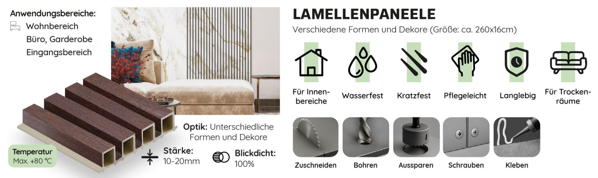 Lamellenpaneele aus WPC zeichnen sich durch ihre hohe Stabilität, Flexibilität und elegantes Design aus. Sie bieten eine Vielzahl von Einsatzmöglichkeiten im Innenausbau, Möbelbau, Ladenbau und als Wandverkleidung in modernen Wohnräumen. Besonders bemerkenswert ist ihre harmonische Kombinierbarkeit mit anderen Wandpaneelen – so lassen sich verschiedene Materialien und Oberflächenstrukturen ideal miteinander verbinden, um einzigartige Raumgestaltungen zu schaffen.
