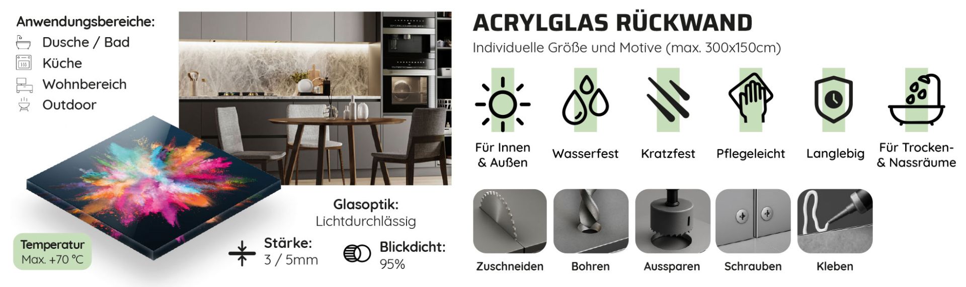 Ein weiterer großer Vorteil: Acrylglasplatten lassen sich mit handelsüblichem Werkzeug einfach und präzise bearbeiten. Vor Ort können problemlos Zuschnitte, Bohrungen oder Fräsungen durchgeführt werden.