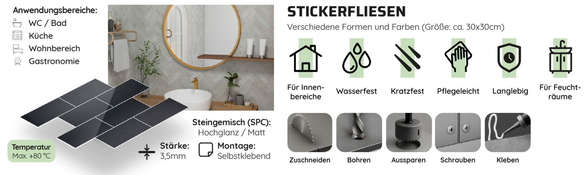 SPC-Stickerfliesen sind feuchtigkeitsbeständig, kratzfest und formstabil, wodurch sie sich ideal für den Einsatz in Küche, Bad, Flur oder auch im Wohnbereich eignen. Gleichzeitig bieten sie eine überzeugende Alternative zu herkömmlichen Fliesen, da sie deutlich leichter und einfacher zu verarbeiten sind.