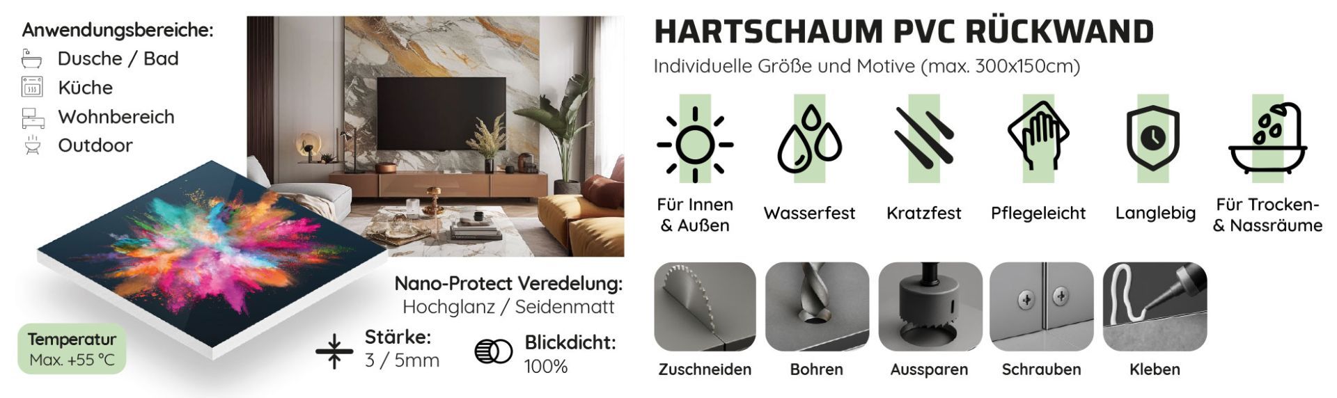 Hartschaumpaneele zeichnen sich durch ihre Kombination aus geringem Gewicht, hoher Formstabilität und guter Witterungsbeständigkeit aus. Das vielseitige Material – meist aus PVC-Hartschaum gefertigt – überzeugt durch seine robuste, feuchtigkeitsresistente Oberfläche und eine angenehme Verarbeitung. Diese Eigenschaften machen Hartschaumpaneele zur idealen Lösung für zahlreiche Anwendungen, z. B. im Innenausbau, Messe- und Ladenbau, der Werbetechnik oder im Sanitär- und Küchenbereich.