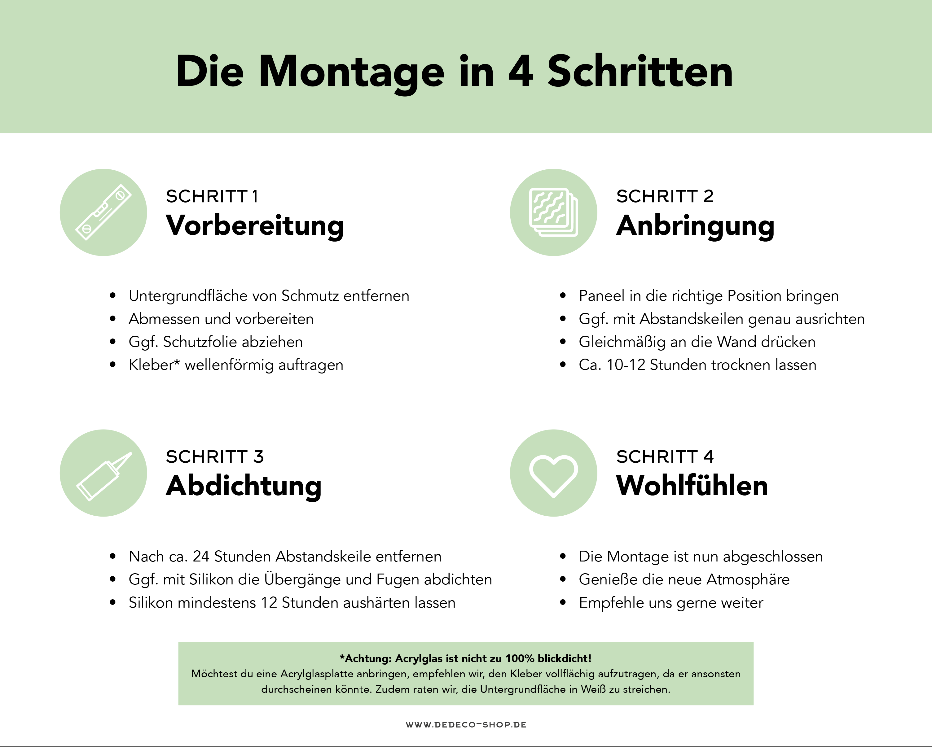 Achtung: Acrylglas ist nicht zu 100% blickdicht! Für die Montage empfehlen wir bei Acrylglas den Kleber vollflächig aufzutragen, da der Kleber ansonsten durchscheinen könnte. Weiterhin empfehlen wir die Untergrundfläche weiß zu streichen.